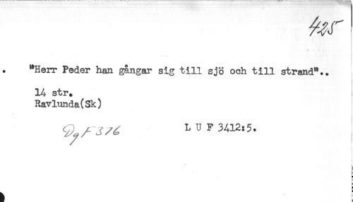 //// "Herr Peder han gängar sig till sjo och till strand".. //// 14 str. //// Ravlnnda(Sk) //// LUF3A12,5. //// Y //// L //// E ////