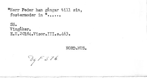 //// ! //// "Herr Peder han gångar till sin, //// fostermoder in **...... //// SÖ. //// Vingåker. //// E.U.20ia4.Visor.III.s.<463. //// NOKD.MUS. //// %,< / ^ ^^ ////