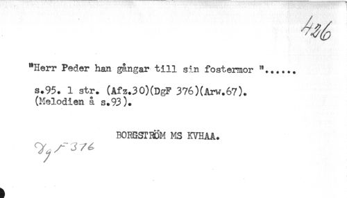 //// "Herr Peder han gångar till sin fostermor //// s.95. 1 str. (Afz.30)(DgF 376)(Arw.67). //// (Melodien å s.93). //// BORGSTRÖM MS KVHAA. ////
