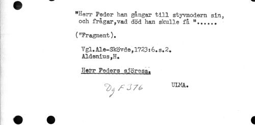 //// "Herr Peder han gångar till styvmodern sin, //// och frågar,vad död han skulle få "...... //// ("Fragment). //// Vgl.Ale-Skövde,1723:6.s.2. //// AldeniusyH. //// Herr Peders sjöresa. ////