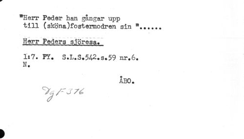 //// "Herr Peder han gångar upp //// till (sköna)fostermodren sin "...... //// Herr Peders sjöresa. //// 1:7. PY. S.L.S.542.s.59 nr.6. //// N. //// ÅBO. //// ^ / ^ ^ ////