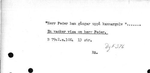 //// "Herr Peder han gångar uppå kammargolv //// En vacker visa om herr Peder. //// B 79:2. s.100. 13 str. //// ^ J/X //// ^ RA. ////