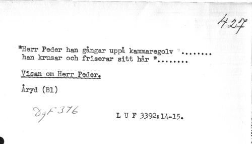 //// "Herr Peder han gångar uppå kammaregolv --........ //// han krusar och friserar sitt hår "...____ //// ^ ^ ^ v w v # W //// i //// Visan om Herr Peder. //// i //// Aryd (Bl) //// LUF 3392:14-15. //// & //// ! //// < ////