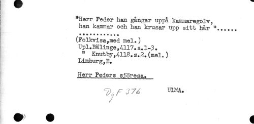 //// (Folkvisa,med mel.) //// Upl.Bälinge,4117. s. 1-3. //// " Knutby,4118.S.2.(mel.) //// Limburg,E. //// . //// Herr Peders sjöresa. //// ^ ULMA. ////