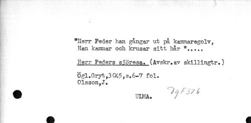//// "Herr Peder han gångar ut på kammaregolv, //// Han kammar och krusar sitt hår //// Herr Peders sjöresa, (åvskr.av skillingtr.) //// Ögl.Gryt,3%5,s.6-7 fol. //// Olsson,J. ////