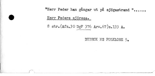 //// "Herr Peder han gångar ut på sjogastrand //// ^^ Herr Peders sjöresa. //// ! 8 str.(Af3.30 DgF 376 Ar^^67)s.T33 Å. //// DYBECK MS FOLKLORE 5. //// _ - ____.___ ////