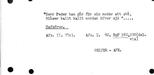 //// "Herr Peder han gar for sin moder att stå, //// Blåser kallt kallt nordan öfver sjö "..... //// Hafsfrun. //// Afz. II. 77:1. Afz. 1. 92. DgF 380,378(del- //// -vis) //// GEIJER - AFZ. ////