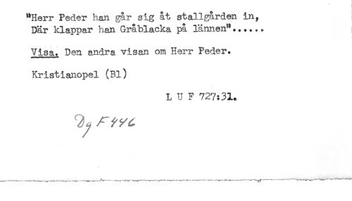 //// "Herr Peder han går sig åt stallgården in. //// Där klappar han Gråblacka på larmen"...... j //// Visa. Den andra visan om Herr Peder. //// Kristianopel (Bl) //// L U F 727:31. ////