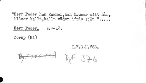//// t //// ! //// "Herr Peder han kapimar,han krusar sitt har, //// blåser kallt,kallt vader ifrån sjön //// Herr Peder. s.9-12. //// Torup (Hl) ! //// < //// I.F.G.H.868. //// t ////