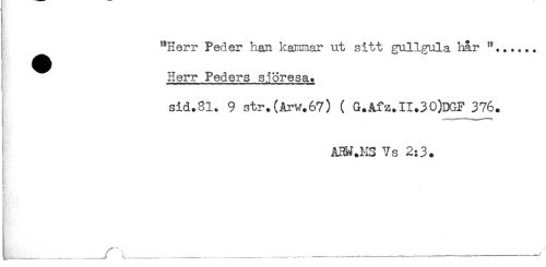 //// ^Herr Peder han kammar ut sitt gullgula liar //// j Herr Peders sjöresa. //// sid.Sl. 9 str.(Arw.67) ( G.Afz.II.30)DGF 376. //// t* //// A3N.1-IS Vs 2:3. //// . //// _____ ____r —- ----- ////
