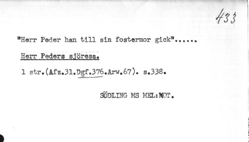 //// i //// - //// "Herr Peder han till sin fostermor gick"...... ! //// Herr Peders sjöresa. //// 1 str.(Afz.31.Dgf.376.Ärw.67). s.338. //// i //// SCDLING MS MEL:MOT. //// [ //// - //// L- //// B //// ! ////