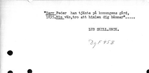 //// * //// "Herr Peder han tjänte på konungens gård; //// 1835.Min vän.tro att himlen dig hämnar"..... //// LUB SKILL.UNIK. //// . ////