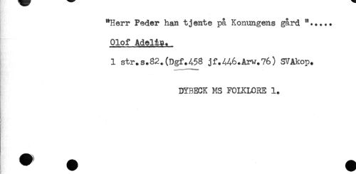 //// "Herr Peder han tjente på Konungens gård //// Olof Adelia. //// 1 str.s.82.(Dgf.A58 jf.446.Arw.76) SVAkop. //// DYBECK MS FOLKLORE 1. ////