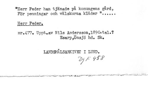 //// "Herr Peder han tjänade pa konungens gard, //// För penningar och välskurna kläder //// Herr Peder. //// nr.477. Uppt+av Nils Andersson,l890-tal.? //// EsarpyOnsjö hd. Sk^ //// LANDS^LS ARKIVET I LUI^D. ////