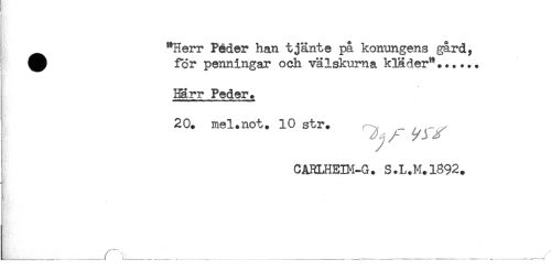 //// "Herr Peder han tjänte på konungens gård, //// ^ för penningar och välskurna kläder"**.... //// i Härr Peder. //// 20. mel.not. 10 str. - , / //// A ^ j y //// CARLHEIH-G. S.L.M.1892. //// . ////