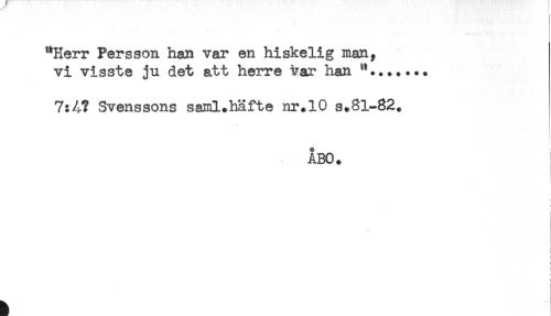 //// **Herr Persson han var en hiskelig man, //// vi visste ju det att herre ^ar han ....... //// 7:4? Svenssons saml.häfte nr.10 s.81-82. //// t //// ÅBO. //// i ////