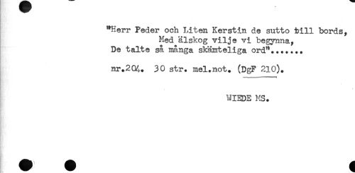 //// "Herr Peder och Liten Kerstin de sutto till bords. //// Med älskog vilje vi begynna, //// De talte så många skämteliga ord"....... //// nr.2%. 30 str. mel.not. (DgF 210). //// WIEDE MS. ////