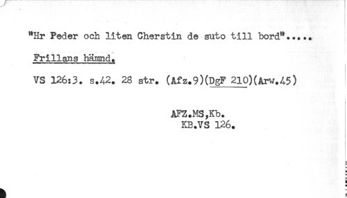 //// "Hr Peder och liten Cherstin de suto till bord"..... //// Frillans hämnd. //// < //// VS 126:3. S.A2. 28 str. (Afz.9)(DgF 2lO)(Arw.A5) //// t //// AFZ.MS,Kb. //// KB.VS 126. //// * //// H //// H ////