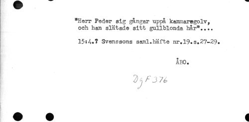 //// "Herr Peder sig gångar uppå ksgmnarBgolv, //// och han slätade sitt gullblonda hår".... //// 15:4.? Svenssons saral.häfte nr.l9.s.27-29. //// ÅBO. ////