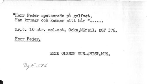 //// "Herr Peder spatserade på golfvet. //// Han krusar och kammar sitt hår '*...... //// nr.5. 10 str. mel.not. 0cke,M3rsil. DGF 376. //// Herr Peder. //// ERIK OLSSON MUS.^HISI.MUS. ////