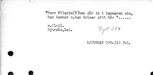 //// "Herr Pilarin(?)han gar in i kammaren sin, //// han kammar o.han krusar sitt hår "...... //// s.11-12. //// Bjursås,Dal. //// LJUNGMAN GBG:312 fol. //// ^ A ^ ////