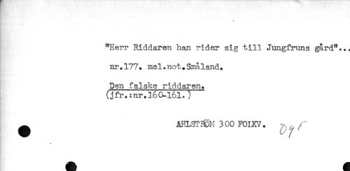 //// . //// : //// "Herr Riddaren han rider sig till Jungfruns gård".., //// nr.177. mel.not.Småland. //// ..... //// Den falske riddaren. //// (jfr.:nr.l60-l6l.) //// ^ AHLSTH6H 300 F0IKV. ^ ////