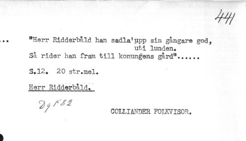 //// ,.. ^Herr Ridderbåld han sadla'upp sin gångare god, //// uti lunden. //// Så rider han fram till konungens gård"...... //// S.12. 20 str.mel. //// Herr Ridderbåld. //// 3 i? ^ //// / COLUMDER F07XVIS0R. ////
