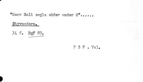 //// "Herr Roli segla söder under 3"...... //// ...... <....... * //// Styvmodern. //// 34 f. DgFj39. //// F S F . V:l. ////