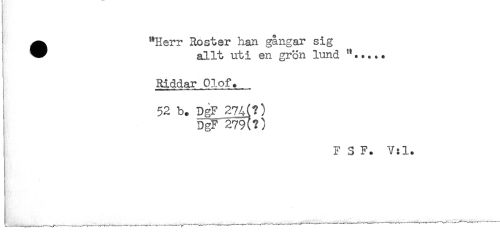 //// ^ "Herr Roster han gångar sig //// * allt uti en grön lund //// Riddar Olof. //// 52 b. DgF_274(?) //// D^F*279(?) //// F 3 F. V:l. ////