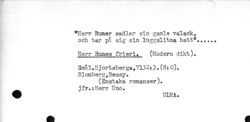 //// "Herr Runer sadlar sin gamle valack, //// och tar på sig sin luggslitna hatt"...... //// . . //// * //// Herr Runes frieri. (Modern dikt). //// Smål.Hjortsberga,7132:3.(8:0). //// Blomberg,Bessy. //// (Enstaka romanser). //// __jfr.:Herr Uno. //// ^ ULMA. //// * ////