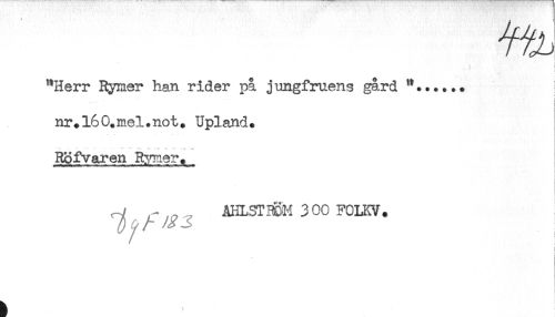 //// f //// t //// "Herr Rymer han rider på jmigfruens gård "...... //// ....... * //// nr.l60.mel.not. Upland. //// Röfvaren Rimer. //// r-J AHLST9&M 30C FOLKV. //// i //// < //// i ////