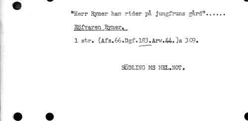 //// "Herr Ryiaer han rider på jungfruns gård^...... //// Röfvaren JRymer.^ //// - //// 1 str. (Afz.66.Dgf.l83.Arw.4A.)s 303. //// SÖDLING MS MEL.NOT. ////