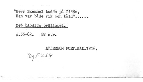 //// "Herr Skamme! bodde på Tidön, //// Han var både rik och båld"...... //// Det blodiga bröllopet. //// s.55-62. 28 str. //// AITERBOM PCET.KAL.1816. ////