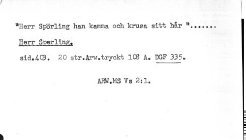 //// "Herr Sporling han kamma och krusa sitt hår ..........] //// Herr Sperling. j //// siå,4Q3. 20 str.Arw.tryckt 1C6 A. DGF 33?. ! //// ARM.M3Vs2:l. //// * ! ////