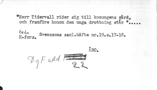 //// ' ' t //// "Herr Tidervall rider sig till konungens gård, I //// och framföre honom den unga drottning står //// 6* A //// Bofors. ^^^sons saml.häfte nr.19.s.17-18. //// ÅBO. //// / ////