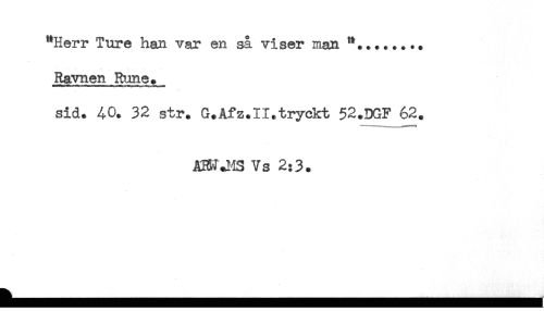 //// "Herr Ture han var en så viser man //// Ravnen Rune. //// sid. 40. 32 str. G.Afz.II.tryckt 52.DGF 62. //// AH^JiS Vs 2:3. ////