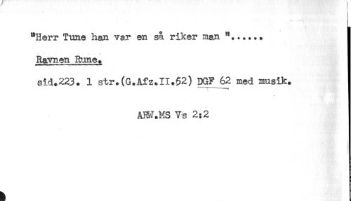 //// "Herr Tune han var en så riker man ] //// Ravnen Rune. j //// sid.223. 1 str.(G.Afz.II.$2) DGF 62 med musik. ] //// AHH.MS Vs 2:2 ////