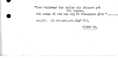 //// "Herr Waldemar Han sadlar sin gångare grå //// Uti lunden, //// ^^ Och sedan så red han sig åt Konungens gård //// j ^^ //// nr.217. 40 str.mel.not.(DgF 82). //// v //// WIEDE MS. //// ...........—< //// iL //// t //// ______ .__/ t........... ....' ////