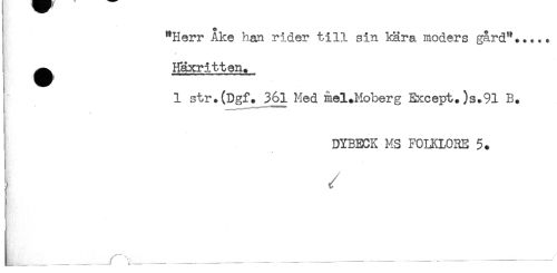 //// "Herr Ake han rider till sin kära moders gård",.... //// / //// ^ Häxritten* //// " "... ' //// 1 str.(Dgf. 361 Med mel.Moberg Except.)s.91 B. //// DYBECK MS FOLKLORE //// L_______ r_____ _______ - - - - - ////