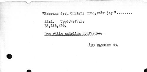//// "Herrans Jesu Christi brud,står jag "*....... //// 22:4. Uppt.Wefvar. //// R5,136,256. //// Den rätta andeliaa hö^färd#^. //// ÅBO RANCKEN MS. ////