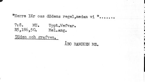 //// r //// & //// H //// "Herre lär oss dödens regel,medan vi //// 7:8. MU. Uppt.Wefvar. //// R5,186,50. Mel.ang. < //// Döden och crrafven. S //// ÅBO RANCKEM MS. } //// H //// i— //// H //// ! ////