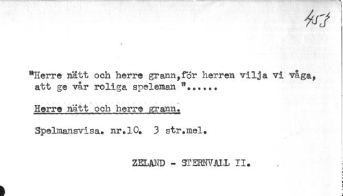 //// t //// "Herre hatt och herre grann,för herren vilja vi våga, //// att ge vår roliga speleman //// Herre nätt och herre grann. //// Spelmansvisa. nr. 10. 3 str.mel. //// ZELAND - STEHNVALL II. //// F //// ä * ! ////