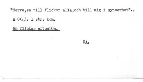 //// "Herre,se till flickor alla,och till mig i synnerhet".. //// A 80:3. 1 str. kom. //// En flickas aftonbön. //// Rå, //// * ////