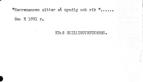 //// "Herremannen sitter så myndig och rik "+..*.. } //// ? //// t //// Se: E 1891 r. //// KB:S SKILLINGTRYCKSREG. ! //// A //// ; //// t //// f //// t //// t. ////