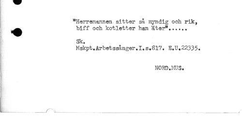 //// "Herremannen sitter så myndig och rik, //// ^^^ biff och kotletter han äter"...... //// Sk. //// Mskpt.Arbetssånger.I.s.817. E.U.22335. //// NORD. ms. //// L___^____.__/ ////