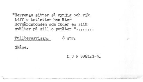 //// "Herreman sitter så myndig och rik //// biff o kotletter han äter //// Hovgårdsbonden som foder en slik //// svälter på sill o potäter //// Tullber^svisan. 8 str. //// Skåne. //// L U F 3381:1-5. ////