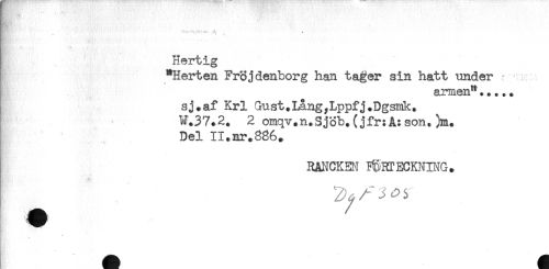 //// K;- //// Hertig //// "Herten Fröjdenborg han tager sin hatt under i //// armen"..... //// sj.af Krl Gust.Lång,Lppfj.Dgsmk. //// W.37.2. 2omqv.n.Sjöb.(jfr:Å:son.)m. //// Del II.nr.886. //// RÅI^CKM P§RTECKNING. //// ^ A ^ - ////