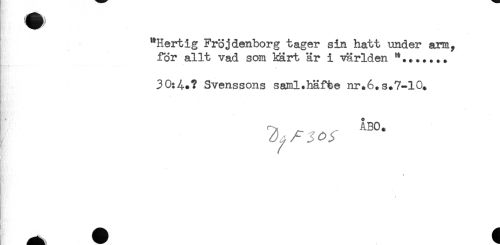 //// "Hertig Fröjdenborg tager sin hatt under arm, //// för allt vad som Ikärt är i världen + //// 30:4.? Svenssons saml.häfte nr.6. s.7-10. //// ÅBO. //// Ht ' ////