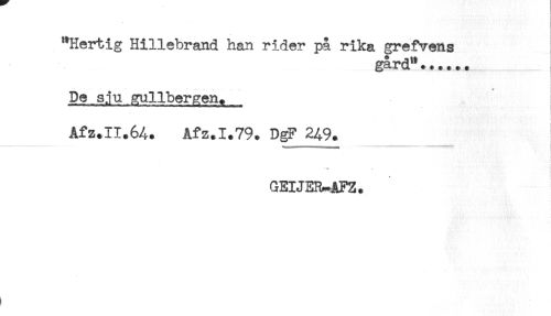 //// "Hertig Hillebrand han rider på rika grefvens //// gård"...... //// De sju Kullbergen. //// * //// Åfz.11.64. Afz.1.79. DgF 2^9. //// GEIJER^AFZ. ////