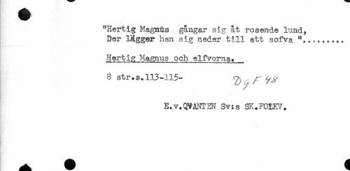 //// / //// "Hertig Magnus gångar sig åt rosende lund. //// Der lägger han sig neder till att sofva //// Hertig Magnus och elfvorna. //// 8 str.s.113-115- //// E.v.QVÅNTM Sv:s SK.FOEKV. //// . //// E'' ^ ////